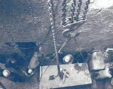 与连环翻板功能类似的是铁索吊石。主要是在墓道顶和墙壁隐蔽处固定若干金属滑轮,利用滑轮将巨石吊起,悬于顶端。墓道地下铺木质机关跷板,索链由石板而下,通过滑轮以隐蔽的方式连接跷板,中间有挂钩和脱钩相接,遇外力压迫可自动脱落。一切完毕后,施以伪装,外人不知其诈。若有盗墓者进得古墓门来,踏中跷板条机关,外力作用迫使绷紧的索链某处挂钩脱落,如同打井的轱辘突然放松,悬空的巨石疾速落下,将躲闪不及的盗墓者拍成肉饼。